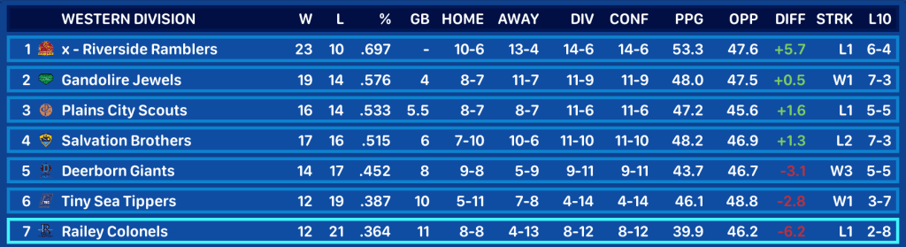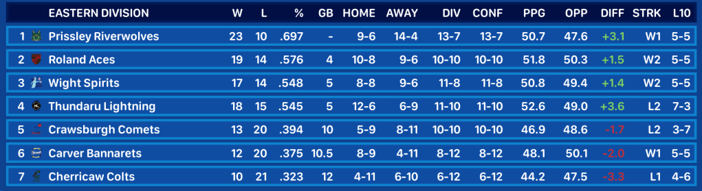 Coming into this week, the Prissley Riverwolves had won 2 straight games since losing 5 out of 6 in their worst stretch of the year. At 21-9, they led the Eastern Division by 4 games over the Roland Aces and Thundaru Lightning.