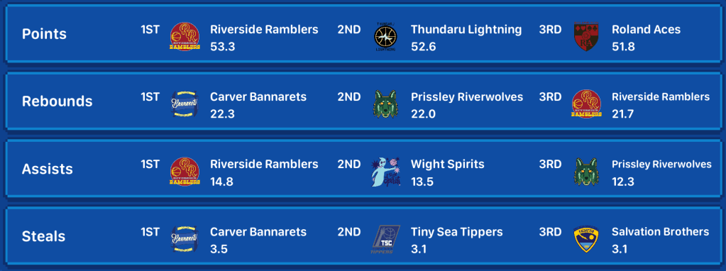 - The league’s hottest team, the Salvation Brothers, pulled off a huge 51-49 win on the road against the mighty Riverside Ramblers to push their win streak to 7 games. The win puts the Brothers in a tie with the Scouts for the West’s last playoff spot. Star Brothers GF Isaac Hart was electric, scoring a career-high 29 points on a career-high 7 threes, along with 4 rebounds, 2 steals, and a blocked shot.