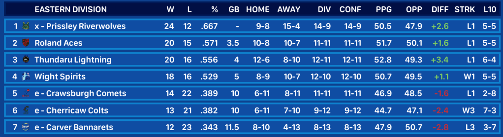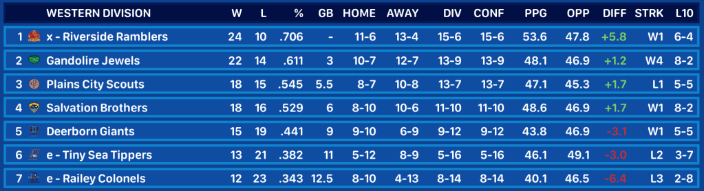 Coming into this week, the Prissley Riverwolves led the Eastern Division by 4 games with 5 games remaining in the season. As the week began, Prissley was tied with Riverside for the league’s best record at 23-10.
